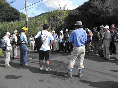 | 田並のお地蔵さんで立ち止まり、熱心に監察する一行。 | ![]() |