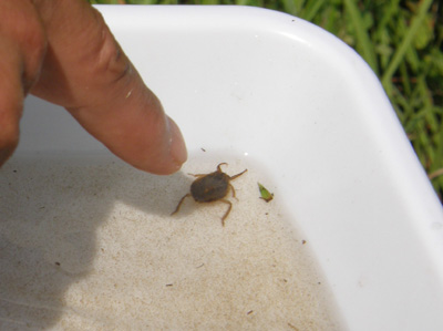 | 沼地に足を踏み入れた南先生。ミズスマシやヤゴなど水生昆虫を次々と採取。写真は絶滅危惧種のコオイムシ。メスはオスの背中に卵を産み付けて、オスが子供を背負って育てる。なんだか身につまされる虫である。 |