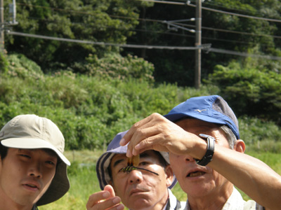 秋のトンボ釣りと言えばこのギンヤンマ。子どもの頃のあこがれのトンボ。しかも♂。 飛ぶのが早く素人にはなかなか捕まるトンボではないが、南先生は下からすくい上げる技で難なく採取。 |