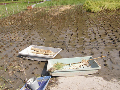 フケ田の稲刈りと言えば田舟。まだ現役でした。 |