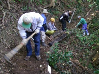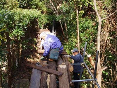 ![]() 串本町有田高場平見の古道および展望台への道の改修を行いました。古電柱を多数トラック&人力で運びあげ、朽ちかけた路側土留めの丸太と交換し、合わせて路面改修も実施。午後から左立谷(さだてだに)に移動し丸木橋を架け替え、無事終了。 (文 けいちゃん) |