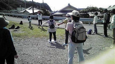 ![]() 今日は、約40人の参加を得て、田並駅〜串本無量寺までウォーク。狼おじさん、たっつんおじさん、阪本さん、蛙ちゃんとともにスタッフ参加。写真は、蛙ちゃん指導のもと、ストレッチ体操をする参加者たち。(文 けいちゃん) 隊員6名参加 |