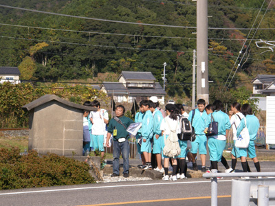 ![]() 昨年に引き続き串本中学校の生徒による古座から串本までの大辺路ウォークが取り組まれ、狼おじさん・たっつん・けいちゃん・ひめひじきの4名が語り部で参加しました。 テレビの取材付きの狼おじさんは絶好調でしたが、後続部隊は「なんでこんな所あるかなあかんの」「腹減った」「もっと早く歩こう」など思ったままを正直に話す子ども達を相手にするのは結構大変でした。 写真はしりでの坂の道標地蔵を解説するたっつん兄。 (文 ひめひじき) |