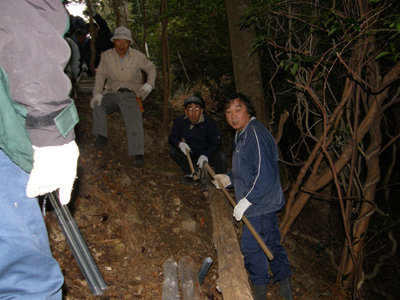 ![]() すさみ町里野と白浜町三ケ川にある富田坂の二カ所の補修作業をおこないました。いずれも以前刈り開いた場所ですが、歩きにくいとか危険であるとか言った指摘のあった場所を、土砂を取り除いたり、階段や土止めを作って安全に歩けるようにしました。 |