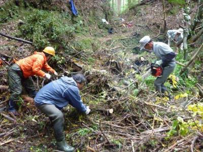 ![]() タッツンはさっそく和深〜有田間をチェックし、古道をふさいだ5〜7本の倒木を一人で処理したと報告くれました。 昼から、地蔵峠コースをチェック、古道には無数の枯れ枝が散乱している。3本の倒木をノコギリで処理しつつ峠へ登っていくと、古道の側の50年生・檜が10本程なぎ倒れている。 谷へ下っていって・・・ビックリした。スダジイが橋へ倒れ込み、橋を巻き込んみ狭い谷を遮断してダム状態になっている。どうやら橋は無事のようだ。段取り決めて作業せなあきません。 雨がタップリ降ったのに・・・なぜか・・林床にキノコはまったく生えていない。 報告 狼おじさん |