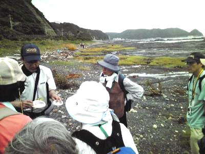 ![]() 「往古田原〜古座の大辺路は磯道・浜歩きだった」と何度も話はしていたが、実際に浜歩きのウォークイベントは今回が初めて。 古座駅を出発。古座街道を少し楽しんで津荷からは浜歩き。 海藻や貝殻、キクメイシ、中国や韓国からの漂着物などのビーチコーミングを楽しむ。 途中、ウミガメの遺体も漂着しており、かつての行路病死人の弔いを誰がやったかが村の境界を決める証拠となった話などをする。 汐の香りも大辺路の魅力。 |