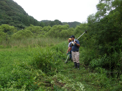 ![]() 8月の末にトンボの観察会を計画している関係で、古座班の3名が田原湿地帯の草刈りにでかけた。 |