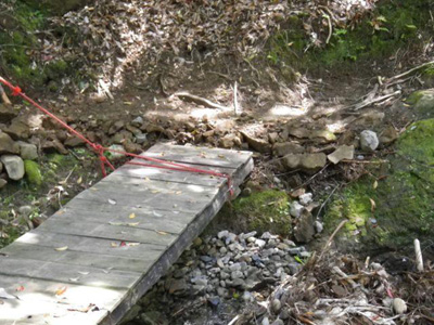 先日の豪雨のフォローで、地蔵峠丸木橋と整備したばかりの田子の石畳を見回ってきました。 丸木橋は落ちてはいませんでしたが、佐部側の岸が増水で削られたらしく、前回補修時に石を積んで道の上にかかるように設置したはずですが、今日見た感じでは、やや道の下に沈み込み、傾斜がより急になっています。渡るのには問題ありませんが、梅雨時前にかさ上げ工事が必要と思います。 田子の石畳は落ち葉や腐葉土が道の上に流れた形跡がありますが、整備した排水路は機能しており、崩壊したところは見られませんでした。路測に穴をあけて新設した一番上の排水路はゴミがつまって石畳まで溢れた跡があり、次回さらに整備が必要です。(けいちゃん) |