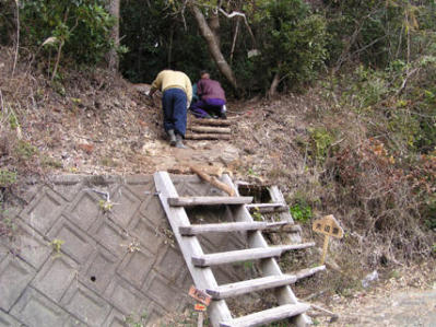 隊長・けいちゃん・いーちゃん・狼おじいさん・熱血先生・ひめひじきで作業開始。危険箇所を修復した時点でヘラノキさんが参加。 階段を修理して作業終了のつもりで弁当を食べていたら、有田財産区おじさんがチェックに来て、やり直しを命じられ、追加作業。完璧になりました。 報告 ひめひじき |