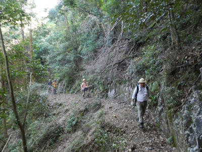 ![]() 古座街道法師峠越えを道整備下調べを兼ねて探索。小板橋さん、狼おじさん、長井坂おじさん、わカミン、蔵土おじさんに、古座川町観光協会事務局、すさみ町関係者ら総勢12人が参加。 国の登録文化財になった白壁と石垣も立派な福田家前をスタートして大附の太陽光発電所まで踏破。 法師峠からの下り坂が特に荒れていて、丸木橋も老朽化がひどく架け替え要。じっさい私も板を踏み抜く始末。 報告 けいちゃん |
