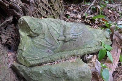 新春大スクープです! 田並の大辺路池ノ谷に、珍しい涅槃像(寝仏)があり、大辺路ウォーカーに人気のスポットになっていますが、釈迦涅槃像にしては頭髪が螺髪(パンチパーマみたいな髪型)では無く、つるつるの僧形で、手にお経らしい巻物を持っているのが気になっていました。それが、田並の天満神社をたまたま訪れたとき、本殿脇の妙見神社の祠の前に、これと良く似た寝仏像があるのを発見。台座に何やら文字まで彫ってあるが、神社の祭神を書いた板でよく見えませんでした。そこで、この正月に宮司に頼んで扉を開けてもらい、狼おじさん、文化財おじさん、たっつんおじさんと寝仏を検分しました。そうしたら台座に「日蓮上人涅槃像」と彫ってあるではないですか! お釈迦様の涅槃像と思っていたのが、日蓮上人だったとは! 台座には大正二年の年号と、奉納した田並の人の名が彫ってありました。妙見神社は日蓮宗のお寺によく祀られているので、これも合点がゆきました。写真の上が天満神社の寝仏、下が池ノ谷の寝仏です。これで積年のナゾが解けました! 報告 けいちゃん |