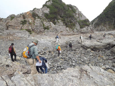 11月30日と12月1日荒船海岸でジオ資源を調査するための、環境省・県・町・民間共同の「あるもの探し」が行われ、隊長・けいちゃん・文化財おじさん・ひめひじきが参加しました。調査を指導してくれたのは県立博物館学芸員の小原さん(化石)。兵庫県立大学准教授の崎山さん(地質)。他に串本町の化石博士佐向さんとあらふねの植物学者宮本先生も参加。転石の中で貝の化石が発見されたり、生痕化石が多数確認されたりと、収穫はたくさんありました。 最大の謎は、田原領では水平になっている地層が浦神領に入ると垂直になっているのはなぜかということで、学者先生にもわからないという事でした。 報告 ひめひじき |