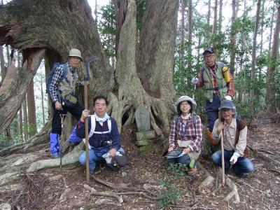 ![]() 今日は天保の国絵図に書かれた佐本〜小節川山越え街道を踏査。古座街道のオーソリティの小板橋さん、佐本の桜井さん、わかミン、イーチャン、狼おじさんが参加。版築の古道も残るいいルートでした。 幹周り6mのシイの巨木の下に祀られている峠のお地蔵様を発見。 お地蔵様の左右に「為両親菩提 天保十二丑秋」足下に「越前産禪明」と刻んでありました。勤行のあと記念撮影。小節川にも道標地蔵2体と庚申像が民家に安置されているのを発見。 報告 狼おじさん |