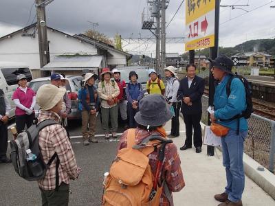 ![]() 旅行会社主催による古座街道ツアーが始まりました。第一回は朝日旅行が募集した、朝来〜鳥渕コース。27名のお客さまが参加されました。朝来駅でオープニングセレモニー。 小出上富田町長もご挨拶に駆けつけてくださいました。この日のガイドはエッちゃんとイーチャンです。私は一行が出発したあと、2回目コースの宇津木坂の下見に向いました。雨が上がって蒸し暑く、汗びっしょり。台風以来のことで、案の定、倒木除去に手間取りました。報告けいちゃん |