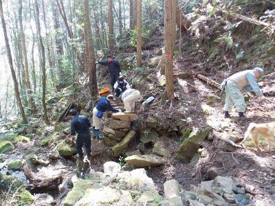 ![]() すさみ町NPO法人魅来づくりわかやま主催で、古座街道福井谷の石畳道整備を行いました。 田鶴横手の尾根道まで数百メートルの石畳道復活に集まったのは、すさみ町佐本地区の町づくりに協力している摂南大学の学生さん、上富田町、すさみ町の有志のみなさん、古座川街道やどやの会、そして大辺路刈り開き隊からは、狼隊長、たっつんおじさん、いーちゃん、たけポン、やまちゃんが参加。福井谷集落跡の倒木除去も行い、屋敷跡石垣にもたれ掛かっていた木や、地主神社の巨木に日が当たるのを邪魔していたスギも何本か伐採しました。 報告 けいちゃん |