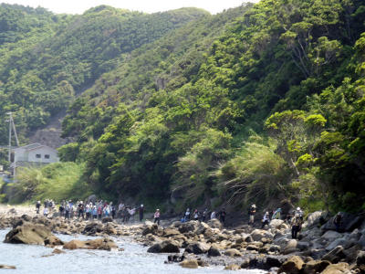 ![]() 4月19〜20日に、くまの体験企画主催の世界遺産10周年記念伊勢路・東紀州踏破ウォークの最終回に参加。ノッティーほかのガイドで、蔵土おじさん、萩やんと浜街道を歩いてきました。七里ケ浜の中の小道はとても快適で、一里塚跡や巡礼墓などが点在し、狼おじさんが来られなかったのが残念でした。報告 けいちゃん |