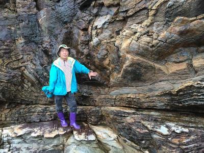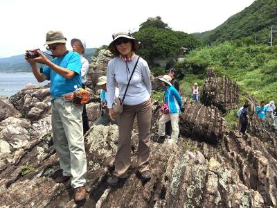 樫野釣公園センターの依頼で紀伊大島一周ジオクルーズのガイドポイントの実地調査を行いました。狼おじさん、火成岩浩子さんとジオガイド3人+南紀熊野ジオパーク推進協議会学術専門委員の中屋先生とで、台風11号のうねりで荒れる外海から紀伊大島の火成岩を観察。橋杭岩をかすめて、紀伊大島を一周しました。昼食後は「地獄の釜」と須江崎の火成岩を観察。ここは火砕岩の上に火山灰が流れて堆積した凝灰岩層が面白い褶曲模様を描いている。 報告 けいちゃん |