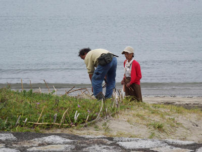 ![]() 狼隊長から緊急招集がかかり、橋杭海水浴場のグンバイヒルガオと岩垂草が海岸清掃の業者に荒らされているので防護の対策が必要との事で、集まりました。 約束の時間の少し前に行ったのですが、既に隊長は作業を開始していました。 グンバイヒルガオは台風の波による浸食のため、繁殖地が削られつつありました。 念のためグンバイヒルガオの株を数本、付近に移植しました。 報告 ひめひじき |
