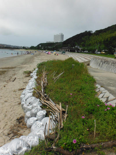 ![]() 橋杭海水浴場のグンバイヒルガオがピンチだと言うので緊急招集がかかりました。涼しそうに水浴びする人たちを眺めながら汗をかいてきました。 最初用意された30枚の土嚢ではまったく足しにはならんとの事で、隊長はコメリに走っていきました。結局130の土嚢を積み上げ、今年の台風をしのげるかどうかという状態にまで持っていきました。 報告 ひめひじき |