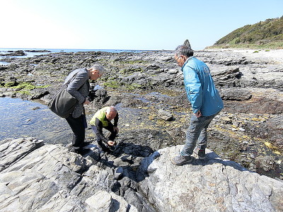 ![]() 著名な民俗学者、野本寛一近畿大学名誉教授が串本にヒジキやマギ(食用雑貝)の食文化について調査に来られ、オオカミ隊長、ひめひじき、元串本海中公園所長の宇井さんと磯をご案内しました。 野本先生からは、熊野古道では最も古い辺路修行の場とみられる大辺路の調査が重要課題とのサゼッションをいただきました。 報告 けいちゃん |