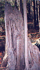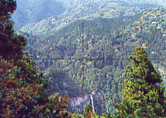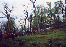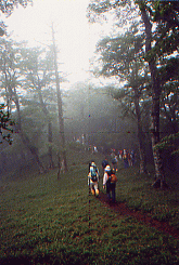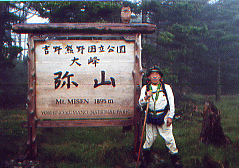 ![]() 大峰山寺(山上ヶ岳・1719m)のすぐ下にある桜本坊宿坊を午前6時出峯した時、山中は灰色の雲に覆われて横なぐりの雨が吹き付ける時化だった。那智山青岸渡寺副住職の高木亮英氏を導師とする熊野修験・秋峯入りに参加しての3日目、吉野の蔵王堂・そして最終目的地である第75番靡(なびき)の吉野川・柳の宿をめざす。 ぬれた岩場の参道を滑らないように注意してくだると、西覗きと呼ばれている断崖絶壁の行場に着いた。自分もそうだが初入山者はここで荒行をこなさなければならない、子供の時親父がここで体験した捨身行の話しを聞いていたので、これからどんなことが始まるかわかっていた。 崖下からモヤのような雲が台風くずれの強風に吹き上げられ、いったいどんな所にいるのか周りはなにも伺えない、ロープをタスキ状に懸けられて崖の端に伏せる。先達が大声で命令した。「合掌しろ」・・・・両手に力が入り強く合掌したとたん突き出され。どんな問いに反応したのか覚えていないが、大声で「ハイ」と返事したとたん・・・さらに突き出され「ウッ」と声がでて体が硬直した。絶壁の岩だなには無数のミヤマリンドウが咲き乱れ、荒行を行っている行者達とはまったく無縁の世界が広がっていた。 ブナ・トガの原生林が荒波にもまれるようにシナリ、激しい葉音をたて風のかたまりがふきあがっていく。ぬかるんだなびき道に足をとられ膝が痛み遅れだしてしまった。 吉野側の女人結界門である五番関を過ぎ、百丁茶屋跡でボランティアの方からお菓子と紅茶の接待を受け、元気を取り戻し気力がわいてきた。 この頃から風もやみ空が明るくなてきて、それまでモヤに覆われていた山々が遠望出来るようになってきた。自然林が姿を消して有名な吉野杉・檜の人工林が続く、四寸岩・青根ヶ峯へと続く稜線のなびき道は、吉野を東と西に分けている。西側(左手)のはるか下界に吉野川が光り、東側(右手)は深い山々が延々と続いていていて東吉野だとわかった。下方に見渡せる山々はほとんど人工林でどこまでも広がっている。 東吉野村の鷲家口に明治38年1月(1905)、米国人マルコム・アンダーソン氏と助手の金井清氏が、吉野地方に棲息している動物の収集に来ていたとき、猟師が捕獲した「日本狼」の死骸を持ち込んできた。8円50銭で買い入れ、標本として処理された日本狼の毛皮と頭骨はスポンサーだった大英博物館に今も保存されている。 写真でみる限り灰色のフサフサした毛皮で、山の神使いだとされていた日本狼の姿を想いうかべることが出来るほど生々しい。いったい自然界にどんな異変が起こったのか・・・・・、この灰色の日本狼を最後に日本には1匹のオオカミもいなくなってしまったようだ・・・?。 約30数年まえの映画「イージーライダー」で二人の主人公が突然ライフルで狙撃される、驚きのラストシーンが今も脳裏に焼き付いているように、なんの前ぶれもなく自然界から人々に畏怖されていた一つの種が忽然と姿を消してしまうなんて・・・そんなことありえるのかな・・?。 幻の獣になってしまった日本狼は。大台ヶ原・大峰連山・果無山脈・・等山々で遠吠えを聞いた・送り狼にあった・毛の混ざったフンを見つけた・狼の子供の死骸を発見した(実はタヌキの子供だった)・山奥で狼とおもわれる獣を目撃した・・・・・等いろいろ世間の話題になり幻の獣を追い求める、冒険心を駆り立てたのだった。鷲家口のあの日からもうすぐ100年に成ろうとしている現在でも、「山中で日本オオカミの写真撮影に成功」といったガサネタの報道が世間を騒がせたり。高知県・仁淀村で「江戸時代、火縄銃で撃ち殺した日本狼の完全な頭骨が屋根裏で発見」・・・と話題になったりして、日本狼がどこか山中で棲息していてほしいと想う願いは。自然保護への盛り上がりとともに、自然回帰・自然崇拝における癒しの体感へと探求心を駆り立ててくれる。 ![]() 青根ヶ峯を横まいて奥千本の義経ゆかりの金峯神社でしばらく休憩したあと、蔵王堂を目指しアスファルトの道を無言の行で下った。3日間における大峰連山での、想像をはるかに超えたきびしい山林トソウは自己の甘えを打ち砕き、ここまで連れて来ていただいた先達にただただ感謝するのみだった。 大峰奥駈修行には、75の靡(なびき)という行場があり、本宮証誠殿が1番・速玉新証殿が2番・那智山飛龍権現が3番の靡で、吉野川の柳ノ宿が75番の靡だと教わった。 3月初旬の春峯入りの那智山から1日駈けて本宮大社までから始まり、4月は本宮大斎原から玉置神社まで、5月は玉置山から行仙の山小屋に1泊して前鬼まで、そして秋峯入りが9月初旬に十津川旭林道登山口から釈迦ヶ岳(1799m)・八経ヶ岳(1915m)という近畿の最高峰を越して弥山の山小屋で1泊・行者還岳・大普賢岳(1780m)から山上ヶ岳(大峰山寺・1719m)の宿坊に2泊目して、吉野の柳ノ宿までの足かけ7日間かけて、大峰奥駈道を駈ける。伊勢に七たび・熊野に三たび・それに大峰に一