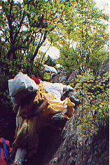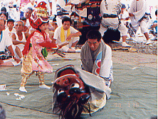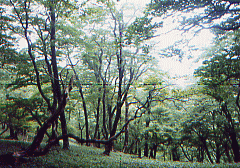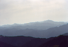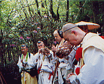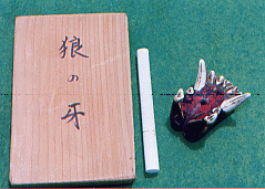 。このへんから天気まで悪くなってきた、右よりの東側に大台ヶ原が遠望できるのだが全く見えない。もうかれこれ25年も大台ヶ原に行っていない、40数年まえ高校の部活で行ったのが最初だった。だがテレビ・・等などの報道によれば、針葉樹はシカの食害にあって立ち枯れし、シットリとコケむした林床がなくなっていると聞く。中国産のオオカミを大台ヶ原に放獣しよう、・・山頂の100haを鋼材のネットで囲みシカの進入を防ぐ、・・猟師の方々にシカを100匹ほど撃ち殺してもらい数を減らす、・・とんでもない針葉樹の立ち枯れは、人間による環境破壊が原因で酸性雨のせいだ。入山する人々の車の排気ガスが一番悪い、・・・と物議をかもしている。 このような事になるとは、大台教会を開祖した古川嵩行者は想像もしなかっただろう。古川行者の伝承によると、一人で大台の山中で修行中・・狼と共にくらしていたと言う。そんな話しは行者の権威付けの為に狼を利用したのかと考えたりしてみたが、実際この伝承はありえない話しではないんじゃないかと思ってしまう。 というのも、北極オオカミの生態を研究していた人が、観察を続けているうちにオオカミの方から、 好奇心をもって近づきオオカミの仲間に入ることができた。・・・dvd「幻の白いオオカミ」として映像に記録されていてテレビでも放映されたことがある。 人間を知らないオオカミが、危害を加えない人に馴れていっしょに山で暮らすことが出来る・・・。そんなことがありえるんじゃないかとかってに想像してみたのだが。 去年は台風一過で2日目はいい天気だった、国見岳(1655m)から遙か遠くに望める釈迦ヶ岳を、指し示されたとき歩いてここまで来たのが信じられなく、熊野からの道のりの厳しさを思い起こした。 北方に山上ヶ岳(1719m)・その手前に大普賢岳(1779m)・小普賢岳の岩壁が障壁のように立ちふさがり行くてを拒んでいる 今からその山頂を越えていくのだという。・・・西方の稲村ヶ岳(1725m)が山上ヶ岳へと稜線を連ねている、絶壁の山頂に作られている木の橋から見渡すと、真下は目もくらむ原生林の深い渓谷が望める。ムササビになれたら、稲村ヶ岳へひとっ飛びに飛んでいけそうだ。 大普賢岳〜山上ヶ岳〜稲村ヶ岳とユー字型に稜線が続いていて、3つの名峰を源として真下には神童子谷が西の方へと流れている、鬱蒼とした原生林に覆われているこの渓谷が熊野川の源流の一つだなんて想像すらできない。熊野那智山〜本宮から北山川・十津川の分水嶺になっている大峰山系のナビキ道を辿って来て水に対する思いを一変させてくれた。、昔の人々が山に棲んでいる水分(みくまり)の神を信じていて・・・春になると里に下りてきて田・畑を潤してくれる・・・命の源である水を生んでくれる山岳を畏怖し、「自然崇拝」していたということが少し実感できるようになってきた。 真下を流れる熊野川・源流域の神童子谷には、不思議に狼に関する地名がある。狼横手・狼尾・犬取り尾・犬ガエリ・犬取滝。・・・みんな「この橋、気持ち悪いな・・・」とくちぐちに言いながら足早に渡った。今年は稲村ヶ岳の方から真っ黒い雲が迫り雷が聞こえていて、大普賢岳の山頂に着いたとき雷の大音響とともに雨が降り出してくる。 山中での雷は一番恐ろしいので急ぎ足で原生林内へと駆け込んだ。女人結界門をくぐり足早にナビキ道を駆けていったが、山上ヶ岳の大峰山寺に着いた時夕方五時を過ぎていた。大峰山寺はすでに閉山しており早朝勤行する事になって、桜本坊の宿坊に入った。 三日目の早朝大峰山寺で勤行の後、本年の新客が西の覗で捨身行の実践を始める。天気が良く雲海が広がっていて山々の稜線を浮き出している、まるで生きた竜のように雲が稜線を駆け上り、瞬時に景色を変えてしまう。新客の引き締まった顔をしりめに、経験者はゲラゲラ笑ってはやし立てる。背中に熊野からの朝日を受けて雲海の激しい動きを見続けた。「ありがたや西の覗にザンゲして・阿弥陀の浄土に入るぞうれしき」、全員唱和の後雲海の中に入っていって吉野へと下っていった。 熊野の各地にある狼に関する地名の山・谷・滝・タワなどは、そこに狼が棲息していた証である。魔よけとして珍重され、各地の家に保存されている「狼の牙の根付け」、各地に残る伝説・伝承、今日これらの狼に関する事柄が人々の記憶から消えてしまおうとしている。 北海道に棲息していたエゾオオカミ(シベリア系・オオカミ)は、明治初期にエゾシカ(缶詰にしてヨーロッパへ輸出していた)や放牧しているウマを喰うとして、毒薬を肉にしみ込ませたり・賞金を懸けてエゾオオカミを狩ったため、学名が「オオカミの王」と名付けられていたエゾオオカミは、人間のエゴによって明治二十年を境に絶滅してしまった。 本土に棲息していたエゾオオカミより小型だったニホンオオカミは、山の神の使い者として畏怖されていてその頭骨・牙付きのアゴ骨が、