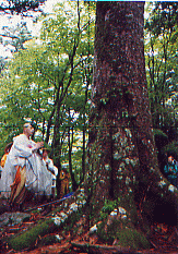 つまり現在登山とかで入山する時、一般的な注意事項とはおもむきが少しちがった、山中における掟ての一つなのだろうと考える。ささいなことだが、このような迷信というか習慣が日常生活において沢山ある。たとえば古座ではよその家に行った場合、「必ず家の屋敷に入って行った所から出て帰る」絶対屋敷内を通り抜けしてはアカンのです。漁師町だから網に入った魚が逃げてしまうという縁起カツギの一つなのだという。 熊野の各地で撮影された映画「火まつり」(原作・中上建次氏)において、主人公(北大路欣也氏)が山仕事をしていたときワナをしかけてウサギを狩る。そのククリの針金をサカキの木に掛けたので仲間からたしなめられる。そんなワンシーンを思い出した。監督柳町光男氏 とは映画の製作中2度ほど合っていろいろお話しを伺った。「熊野の山中は、モノノケの存在が感じられ怖い・・・」と話されていたのが印象的だった。 三月の初旬、午前六時三十分 那智山青岸渡寺を出峯する。高木亮英導師率いる熊野修験春峯入りが今年も始まった。 粉雪が舞い色川側から吹き付ける北西の風が冷たい、舟見峠から大雲取山の地蔵茶屋へと続く熊野古道は、「亡者の出合い」と言われていて妙に淋しい所である。途中大雲取林道を横切り古道を進む、もうこの辺は那智の大滝の源流域ではない。 たまに大雲取山が大滝の源流だと書かれている本もあるが違っている。大雲取道は分水嶺になっていて、東側は高田へ・西側は滝本へ流れていて高田川・赤城川となり熊野川へと流れ出ている。 先達に続き大勢の人たちと駆けているのに、いつも体の芯が「ジンジン」してきて急に五感がサドくなる辺がある・・・・。だから「亡者の出合い」なんて言われているのかと独り言をつぶやく。 「熊野修験道大本山極秘伝」(熊野の研究・二河良英氏著)によると、「色川村、地蔵山の宿迎え大狼出ることあり」とあるから、大雲取には大狼が棲息していて、修験者・参詣者の人たちはこの大狼に出合ったのだろう。だけどこの大雲取山にはもっと恐ろしい怪物がいたという、この怪物はここ熊野だけじゃなく北山・十津川村にもいたという「一本タダラ」である。雪の積もった深山に点々と一列になって規則ただしく続く足跡が、山に棲む「一本タダラ」があるいっていった跡だと伝う。 大雲取山の東側の麓の高田村の(十津川村教育委員会・瀞洞夜話)、権之頭(ゴンノカミ)家の伝承は那智山へ参詣に行った折り、この山中で狼に出合い衣の裾を咬えられて・・岩屋へひきこまれたところ、すぐ側を怪奇なる「一本タダラ」が通っていったという。 狼に命を助けられたのだがお礼をするにも何もなかったので、私が死んだら屍を食ってくれと約束したという、代々葬式の後狼に墓を暴かれたので・・・、家の中庭に墓を移したがやはり狼が出没したと伝う・・・・。 それにこの怪物は那智の山中をうろつき色川村の人々にも害をもたらし。地下の人々が困っていたのだが、仮屋刑部左え門の働きによりこの「一本タダラ」は退治されたという、村の人たちはこれらの功績を称え神としてまつっている。大戸平の熊野古道の側にも碑が建てられている。 ふと思いついたのだが、雪山に一列に足跡をのこす動物がある。オオカミかキツネなどである。姿を見ることがなくてんてんと続く足跡は怪奇な怪物「一本タダラ」の伝説をつくりだしたのだが、その正体は地蔵山の宿に棲息していた大狼だったのだろうか・・・?。 那智の山々には、岩屋という自然の岩窟があり古代修験者がそこにこもって修行したという。千年も前、陰陽師・阿部晴明が妖魔をとじこめたと伝わる白庫降魔窟がどこかにあると伝う。それら岩窟は那智の山に棲む大狼の棲家の一つじゃなかったんだろうと想像するだけでも那智の山々の奥深さが感じられて楽しくなる。 地蔵茶屋で勤行のあと、林道工事によって今は荒れてしまっている奥比丘女滝のすぐ下流の橋を渡り険しい石倉峠・越前峠を越えて小口へ下った。「小雲取山は小口村大山ノ宿あり送り大狼出ることあり」とある。熊野古道で一番険しいと言われている大雲取越山中には、那智山へ参詣する人々を出迎えたり、みまもり安全に送る神使い大狼が棲息していたようである。 小和瀬の橋を渡って、桜茶屋跡を目指し小雲取の急な坂を一歩一歩登る。振り返ると先ほど越えてきた那智山系の山々が黒くそびえ立ち 、よくあんなに遠い所から歩いてきたものだと感慨にふけった。大雲取の迎え大狼・送り大狼に出合うこともなく、小雲取山(如法山)を越して夕方五時前本宮大社に到着し証誠殿にて勤行のあと解散した。 四月初旬朝八時三〇分すぎ本宮の大斎原を出峯し熊野川の浅瀬に素足を洗い、まだ冷たいセセラギの音を聞きながら対岸の備崎まで渡る。つまり禊ぎをするのである。ここから大森山(1078m)までいっきに急登し玉置山をめざす。いよいよ大峯奥駈が始まる。第一番の靡(ナビキ)である大