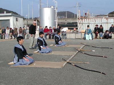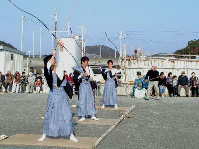 それぞれ2矢ずつ射終わると、肩を直して3歩半下がり着席する。 矢が回収され弓頭に戻される。 以上の動作が2回繰り返される。 |