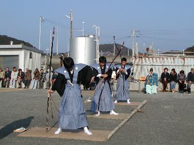 式典終了後、お祓いを受けた 弓・矢・的・穂(木槿)を持って港まで移動。このとき隊列は組まない。 |