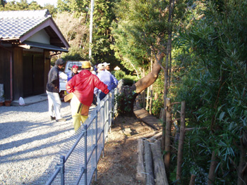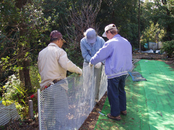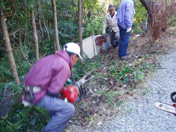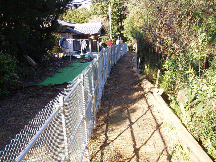 古道が個人の土地を跨いでいる区間は何カ所がありますが、この場所は民家の庭先を厚意で通行させて頂いていましたが、歩く人が増えてきたのできちんとした道の整備が必要ということになり、庭の前の生け垣を刈り開いて整備。一部区間は斜面なので橋を架けました。 橋の材料は鉄パイプと古電柱、そして風倒木を利用しました。イノシシが多く出没する箇所なので、道路との境界を示す猪垣を兼ねたフェンスを設置しました。 |